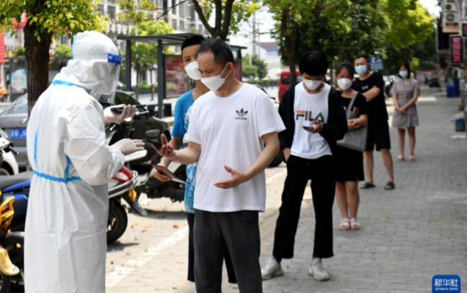 7月3日,安徽省宿州市泗县在该县部分区域开展第六轮核酸检测。图为泗县虹城街道一小区,居民排队等候接受核酸采样。来源:新华社
