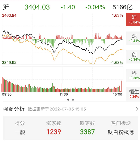 7月5日,A股三大指数探底回升,沪指险守3400点。截至收盘,沪指跌0.04%,报3404点,深成指跌0.41%,创业板指跌0.34%。