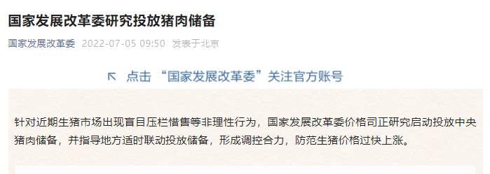 国家发改委官方微信公众号消息,针对近期生猪市场出现盲目压栏惜售等非理性行为,国家发改委价格司正研究启动投放中央猪肉储备,并指导地方适时联动投放储备,形成调控合力,防范生猪价格过快上涨。