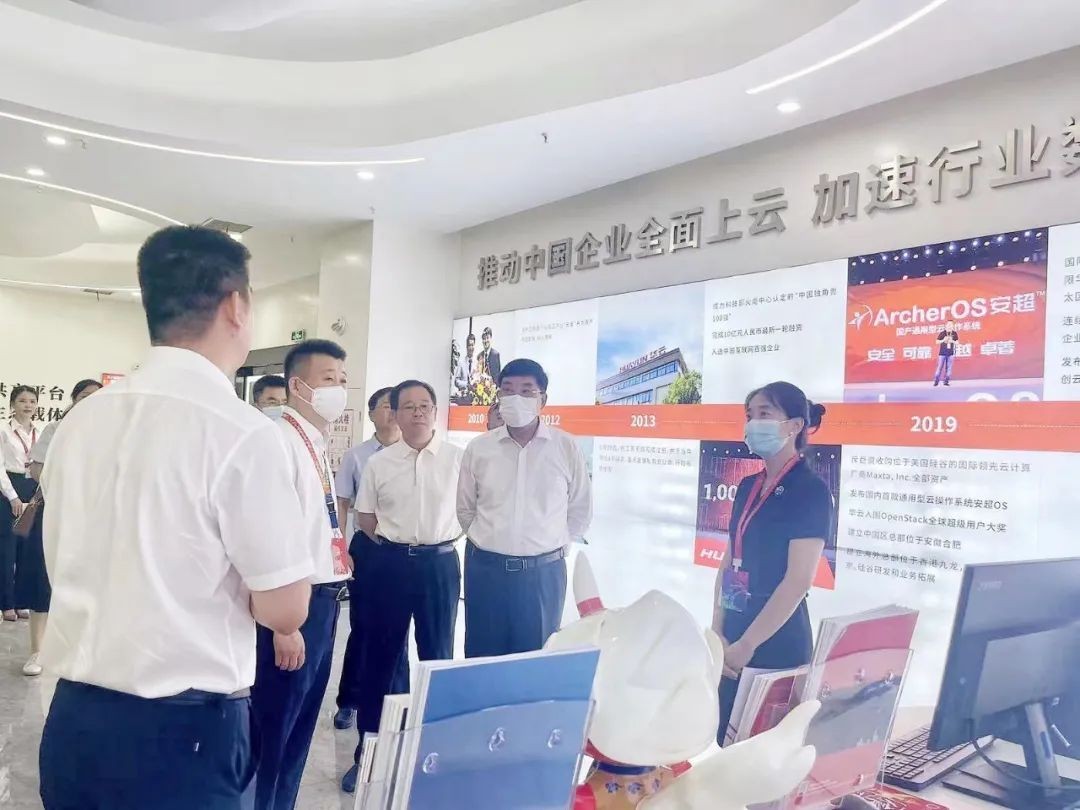 2022年7月5日,安徽省人民政府副省长何树山、省政府副秘书长汪春明以及省经信厅、财政厅、发改委、合肥市政府各部门相关领导莅临华云数据参观调研。华云数据董事长、总裁许广彬,华云数据副总裁王建宏等陪同。