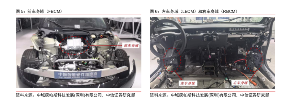 具体来看,中信证券从Model 3域控制器、线束和连接器、电池、三电与热管理、汽车车身等全方位多个角度对该车型进行深入分析,并与其它品牌进行对比评价。随后在其研报里详细呈现每个部件的特点,包括车身域、座舱域、线束、连接器、电池、电芯、电机、车灯、底盘、热管理系统等等。