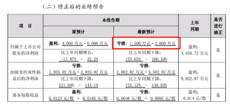 这一修正,使得原本在7月15号披露的业绩预盈直接变成预亏,将上半年至少盈利4000万元的净利润重新计算成至多亏损3000万元,较去年同期下降133.05%-166.10%。
