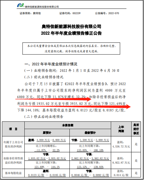 7月25日,奥特佳发布了《2022年半年度业绩预告修正公告》。公告显示,公司预计上半年归母净利润的亏损区间为1500万元至3000万元,同比下降133.05%至166.10%;扣非净利润为亏损2062.82万元至3562.82万元,同比下降123.12%至139.93%。