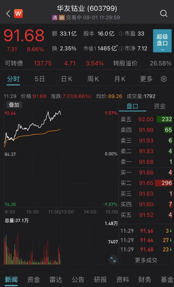 今日上午,“钴茅”华友钴业上涨8.66%,总市值为1465亿元。