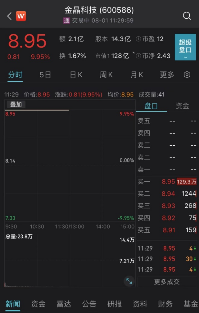1日上午,龙头股金晶科技再度收出“一字”涨停板。截至上午收盘,涨停板上有129.3万手封单。