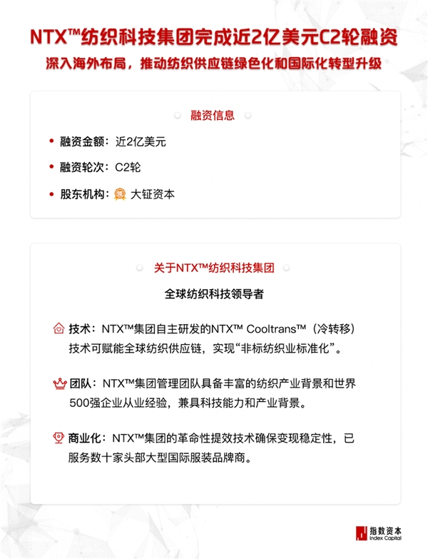 NTX™集团联合创始人、董事长钟博文先生表示,指数资本对纺织行业的透彻理解给我们团队留下非常深刻的印象。交易中的材料准备、机构推荐、路演协助以及法律条款谈判,无一不体现指数资本团队高度的专业水平和令人钦佩的敬业精神。随着合作深入,我们也向指数团队学习到许多,更受益于他们对产业发展方向的洞察与判断。期待未来与指数资本持续合作,为打造全球纺织行业的基础设施共同努力。