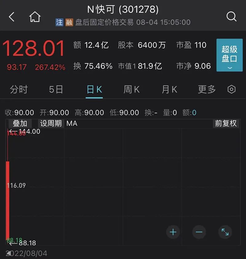 N快可全天成交额12.42亿元,换手率达75.46%。按当日收盘价128.01元计算,中签的投资者单签盈利约4.7万元。