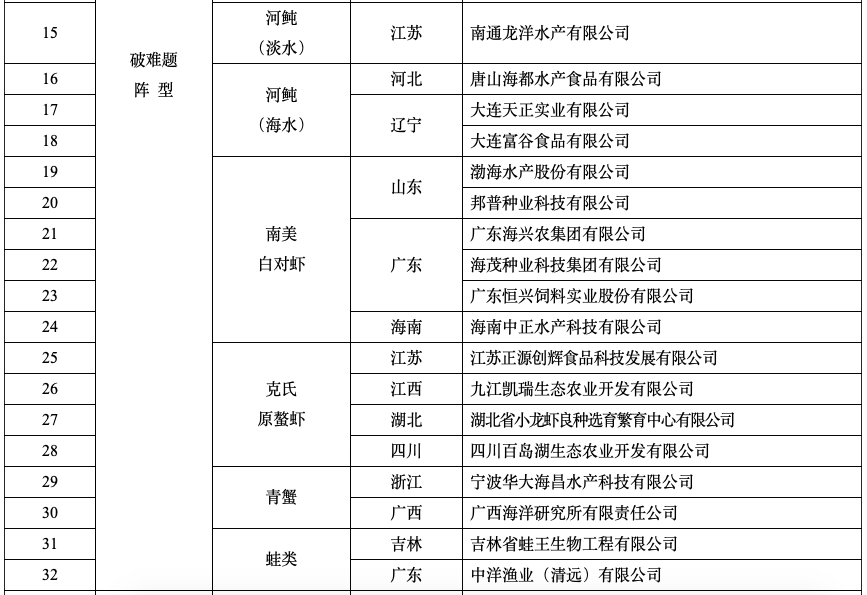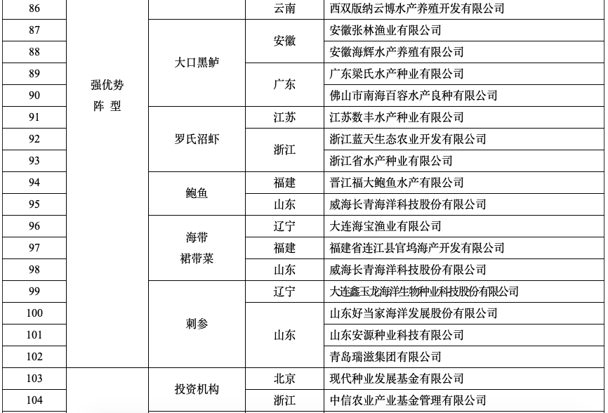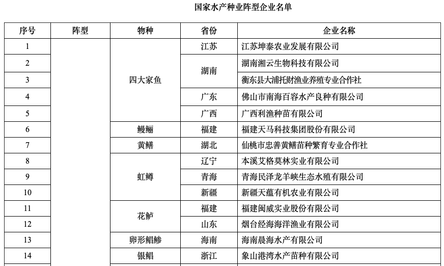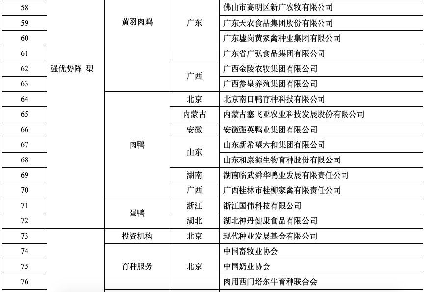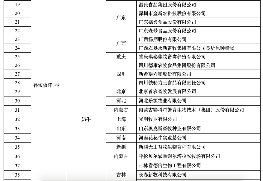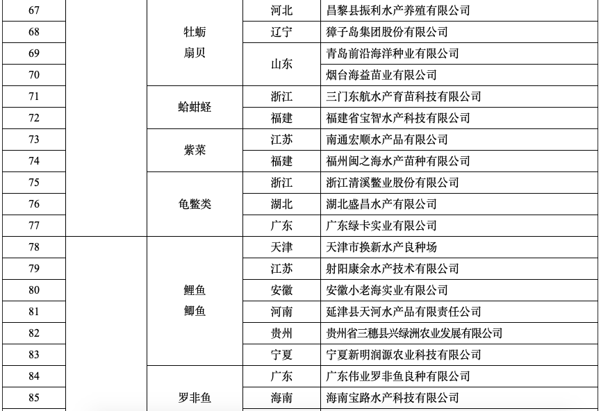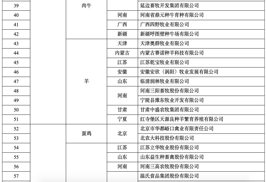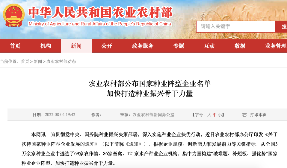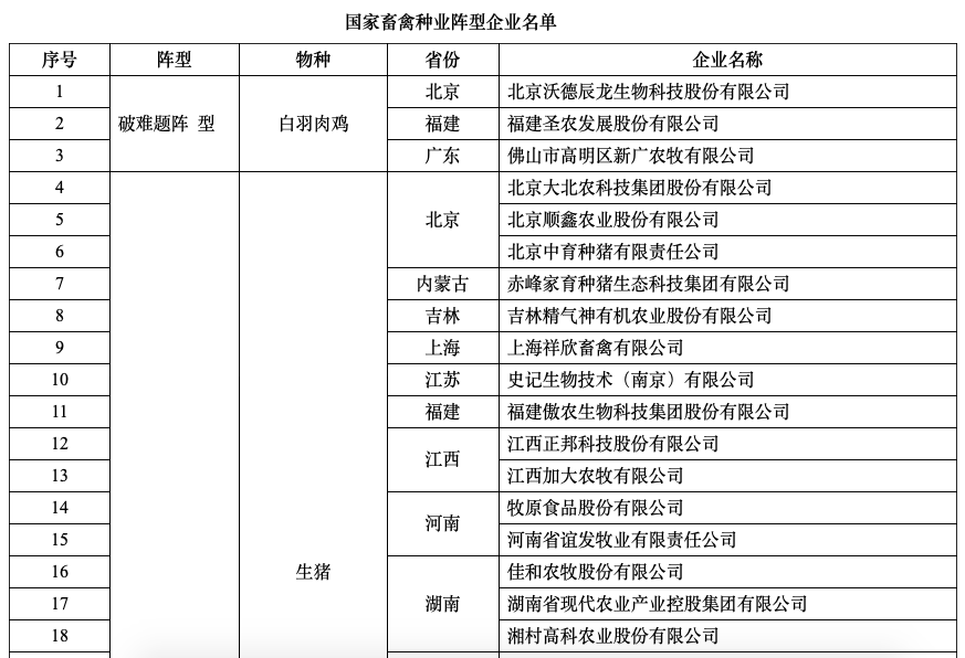 根据本次公布的名单,农发种业、登海种业、隆平高科、敦煌种业、荃银高科、丰乐种业等上市公司入选“国家农作物种业阵型企业”,圣农发展、温氏股份、顺鑫农业、傲农生物、牧原股份、正邦科技、金新农、新希望、立华股份等上市公司入选“国家畜禽种业阵型企业”,天马科技、ST獐子岛、好当家、诺禾致源等上市公司入选“国家水产种业阵型企业”。