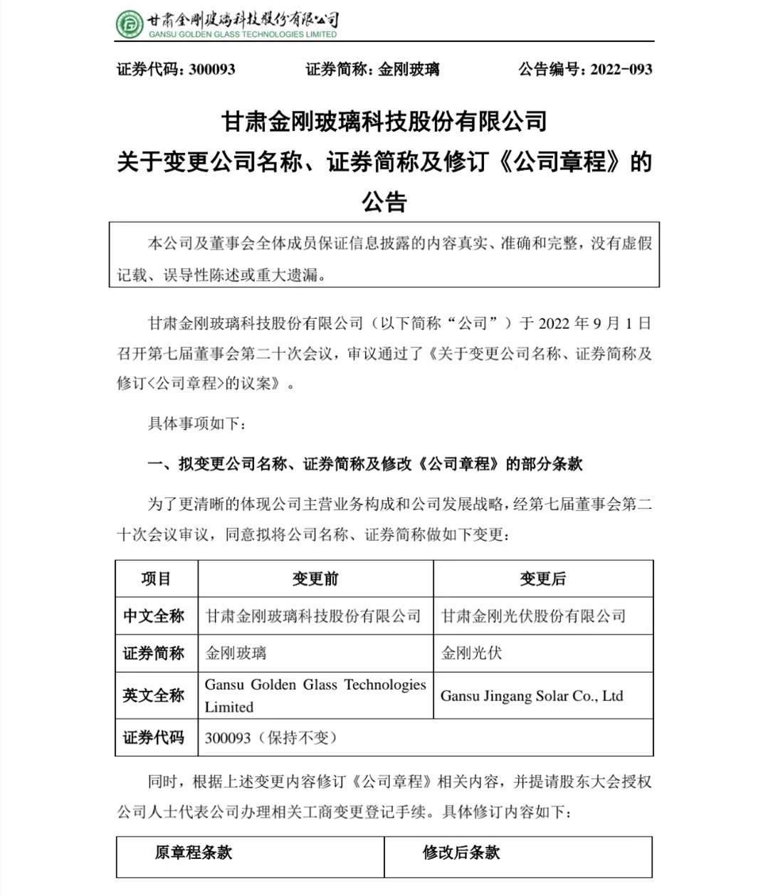 根据公告,为了更清晰地体现公司主营业务构成和公司发展战略,经第七届董事会第二十次会议审议,同意拟将公司名称由“甘肃金刚玻璃科技股份有限公司”变更为“甘肃金刚光伏股份有限公司”,证券简称由“金刚玻璃”变更为“金刚光伏”。