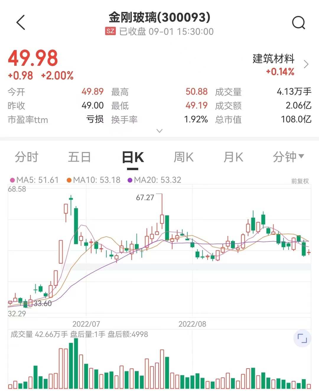 受跨界光伏等利好消息带动,4月底以来,金刚玻璃一路上扬。截至9月1日,金刚玻璃报49.98元/股,最新市值108亿元。