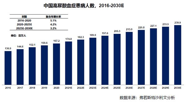 中国痛风和高尿酸血症治疗药物市场空间广阔。根据弗若斯特沙利文分析,未来中国高尿酸血症和痛风患病人数会持续增加,高尿酸血症患病人数预计在2025年/2030年将分别达到2.05亿人/2.39亿人;痛风患病人数预计在2025年/2030年将分别达到4,540万人/5,220万人;对应的中国痛风药物市场规模预计在2025年/2030年将分别增长至29亿元/108亿元。