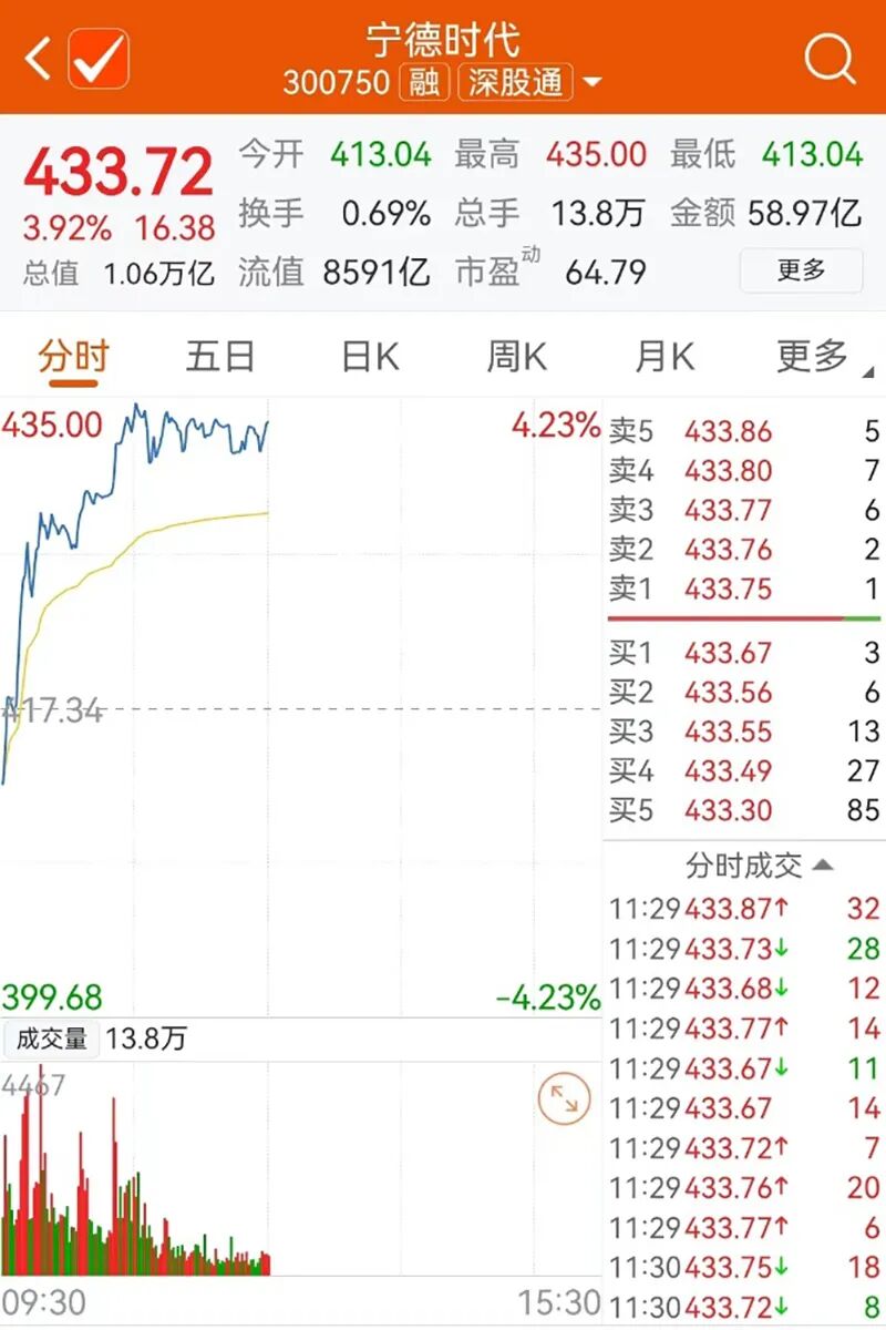 随着北向资金大幅回流,蓝筹股早盘呈现显著的企稳迹象。万亿市值创业板龙头宁德时代早盘股价震荡走高,截至午盘上涨3.92%。