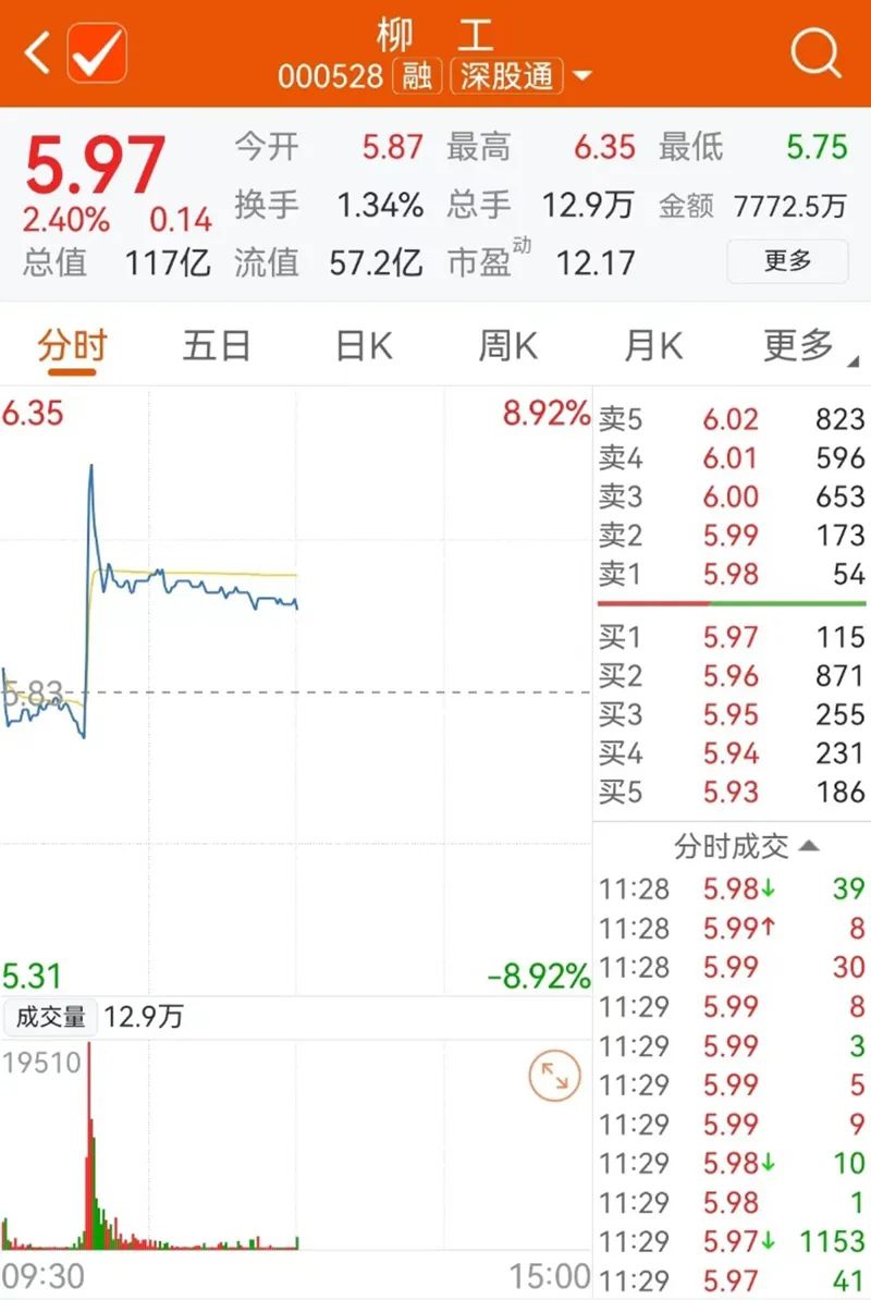 消息一落地,柳工股价随即直线拉升,3分钟涨幅接近10%,并一度逼近涨停。截至午间休市,柳工报5.97元/股,涨幅2.40%,半日成交7772.5万元,较此前有所放量。