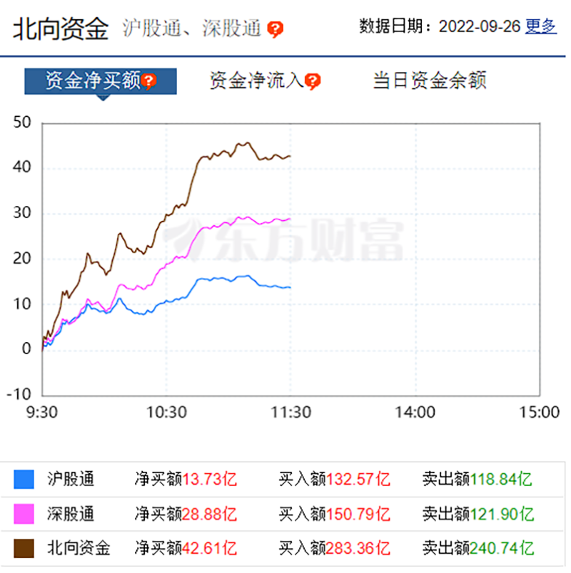 消息面上,为稳定外汇市场预期,加强宏观审慎管理,中国人民银行决定自2022年9月28日起,将远期售汇业务的外汇风险准备金率从0上调至20%。受此提振,离岸人民币对美元短线拉升。随着汇率波动趋于稳定,外资开始回流A股,早盘北向资金净买入额达43亿元。