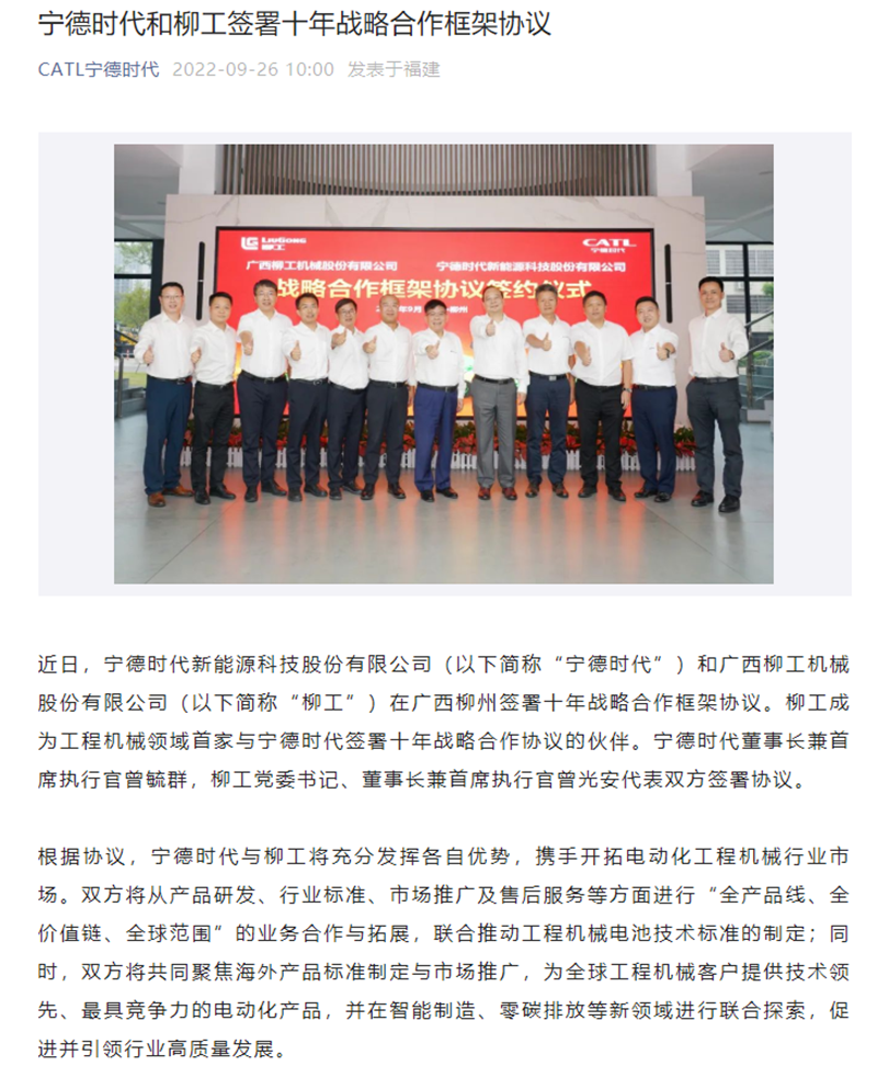 今日上午10时,“CATL宁德时代”官微发布消息:近日,宁德时代和柳工在广西柳州签署十年战略合作框架协议,柳工成为工程机械领域首家与宁德时代签署十年战略合作协议的伙伴。根据协议,宁德时代与柳工将充分发挥各自优势,携手开拓电动化工程机械行业市场。