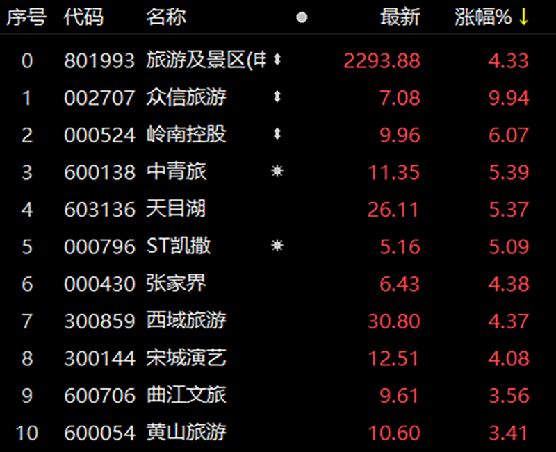 “困境反转”主线集体飙涨,成为早盘市场另一大亮点。截至午间休市,申万“旅游及景区”指数大涨4.33%,众信旅游涨停,中青旅、天目湖等涨超5%;酒店餐饮指数上涨3.95%,华天酒店涨停,君亭酒店涨近8%,西安旅游、西安饮食等涨超3%。
