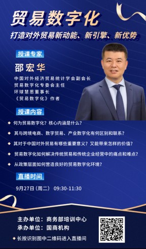 作为国内贸易数字化理论与实践的先行者和倡导者,中国对外经济贸易统计学会副会长、贸易数字化专委会主任、环球慧思董事长邵宏华9月27日为线上4000余名来自地方商务系统、自贸片区、综合保税区、进出口企业、科研院所、银行、信保等有关单位的人员进行了一场精彩直播授课。