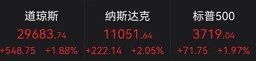 美股三大指数集体收涨,道指涨1.88%,纳指涨2.05%,标普500指数涨1.97%。
