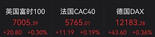 热门中概股多数上涨,每日优鲜涨超33%,微博涨超8%,腾讯音乐涨超5%,阿里巴巴涨超4%,唯品会、拼多多涨超3%。尚乘数科跌超7%,知乎、理想汽车跌超3%,小鹏汽车跌超2%。欧股普遍收涨,德国DAX指数涨0.36%,英国富时100指数涨0.30%,法国CAC40指数涨0.19%。