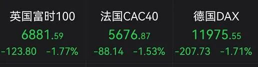 欧股普遍收跌,德国DAX指数跌1.71%,英国富时100指数跌1.77%,法国CAC40指数跌1.53%。
