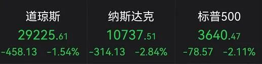 美国上周初请失业金人数19.3万人,预期21.5万人,前值21.3万人。数据公布之后,美股迎来暴击,三大指数低开低走集体收跌,道指跌1.54%,纳指跌2.84%,标普500指数跌2.11%。