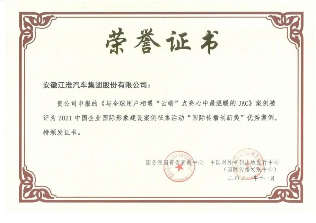 江汽集团海外团队以海外社媒平台为载体,创新开展直播和短视频创作,“与全球用户相遇‘云端’点亮心中最温暖的JAC”活动荣获国际传播创新类优秀案例。