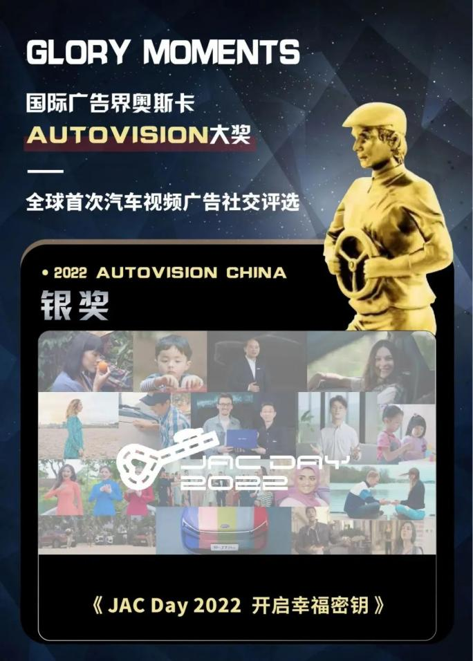 为加强与海外用户的沟通,江汽集团打造 “JAC DAY”海外品牌节,进行了首次跨境电商、首次打造国际文化节IP、首次联同经销商与用户共创节日内容、首次融合线上直播和线下营销等多项创新尝试。“JAC DAY”荣获《2021年中国企业国际形象建设》 国际传播创新奖、IAI汽车营销奖之汽车数字营销奖、AutoVision China银奖。