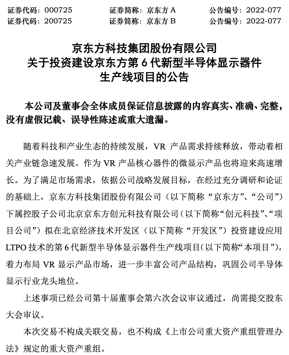 公告称,公司下属控股子公司创元科技拟在北京经济技术开发区投建应用LTPO技术的第6代新型半导体显示器件生产线项目,着力布局VR显示产品市场,巩固公司半导体显示行业龙头地位。