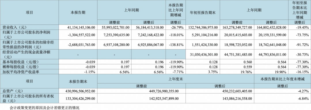 同日晚间,公司披露了三季度业绩。前三季度,公司实现营收1327.44亿元,同比下降19.45%;归母净利润52.91亿元,同比下降73.75%。其中,第三季度营收411.34亿元,同比下降26.79%;归母净利润亏损13.05亿元。