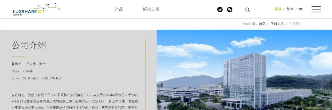 如今的立讯精密,专注于连接线、连接器、马达、无线充电、FPC、天线、声学和电子模块等产品研发、生产和销售,产品应用于3C(计算机、通讯、消费电子)、企业级设备、汽车、医疗等领域,致力于为客户提供一站式采购服务。
