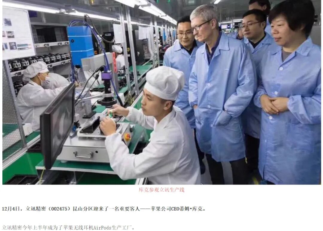 2017年上半年,立讯精密成为苹果公司无线耳机AirPods生产工厂。当年12月4日,苹果公司CEO蒂姆•库克访问立讯精密昆山分区,并表示立讯精密给他印象最深刻的是他们的员工。