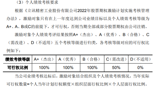 对应个人绩效考核要求,激励对象只有在上一年度达到公司业绩目标,以及个人绩效考核等级为A+、A、B或C的前提下才可行权。否则,当期全部或部分股票期权由公司注销。