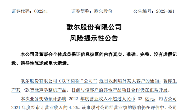 11月9日,歌尔股份公告称,公司近日收到境外某大客户通知,暂停生产其一款智能声学整机产品。本次业务变动,预计影响2022年度营收不超过33亿元,约占公司2021年度经审计营收的4.2%。