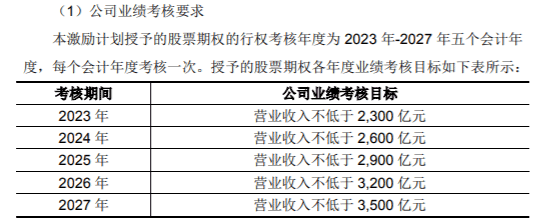 上述被授予对象要行权,必须完成相应的业绩要求。其中,立讯精密在公司层面的业绩要求是,2023年、2024年、2025年、2026年、2027年的营收,分别不低于2300亿元、2600亿元、2900亿元、3200亿元、3500亿元。