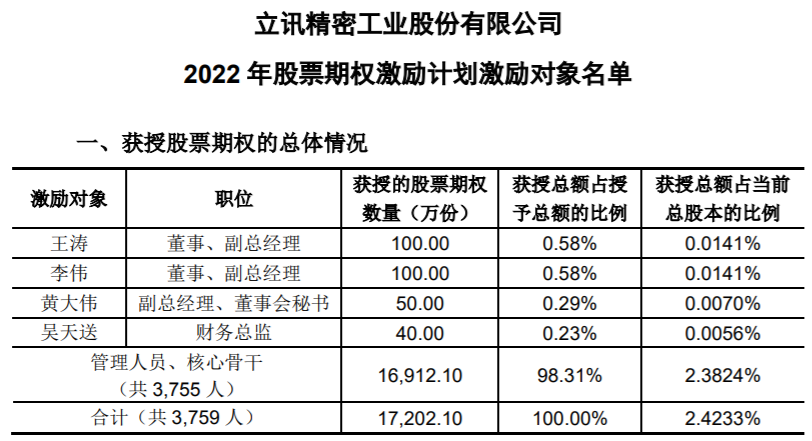 立讯精密介绍,本次激励计划的对象为公司董事、高级管理人员、公司(含子公司及参股公司)中层管理人员及核心技术(业务)骨干,总人数3759人,占公司截至2021年12月31日在册员工总人数228152人的1.65%。