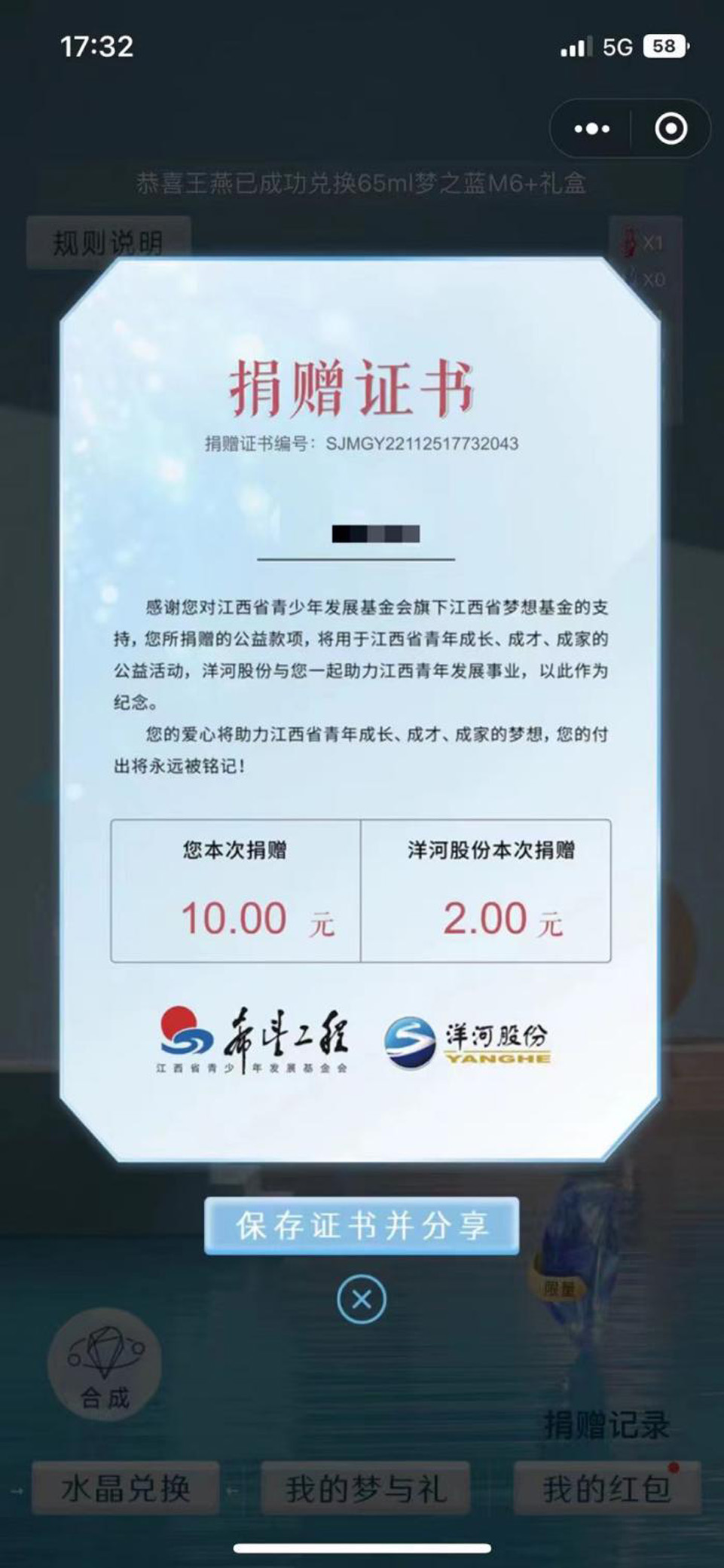 接下来,洋河以梦之蓝水晶版产品为载体,进一步激发与释放每位普通消费者的爱心力量。在江西地区,消费者每扫一瓶梦之蓝水晶版活动产品,洋河股份将捐赠“2”元人民币到梦想公益基金,而消费者开瓶扫码将奖励最低8元至最高888元的现金红包,消费者可以选择提现,也可以选择将红包款项捐赠给梦想基金,与洋河股份一起助力青少年公益事业。捐赠成功后,消费者能获得一张专属于自己的“捐赠证书”。