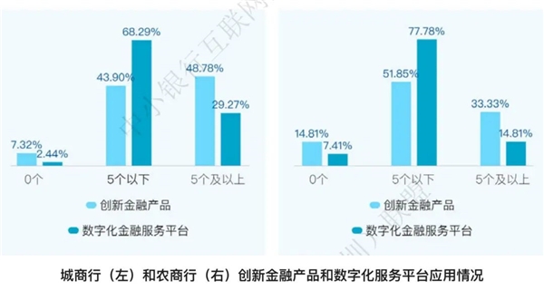 城商行在战略、数据、应用三个维度上较2021年取得显著提升,在受访城商行中仅有7.32%还未推出任何创新金融产品,2.44%还未推出数字化金融服务平台;而48.78%的受访城商行已经推出5个及以上的创新金融产品,29.27%推出5个及以上的数字化金融服务平台。