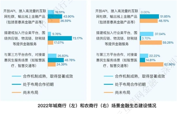 农商行更侧重个人场景金融搭建,问卷调研中51.85%的受访农商行开始布局API开放模式,接入高流量的互联网社群,输出线上金融产品,这说明农商行更倾向于将金融服务嵌入多元化消费场景。