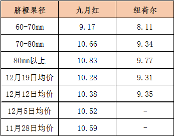脐橙电商销售方面,目前秭归电商平台主销品种为九月红和纽荷尔。截至12月19日,秭归九月红电商销售均价报10.28元/公斤,环比下跌0.96%,同比下跌5.6%;秭归纽荷尔电商销售均价报9.31元/公斤,环比下跌0.43%,同比上涨5.08%。