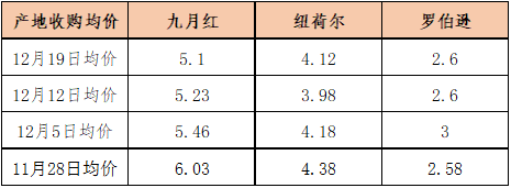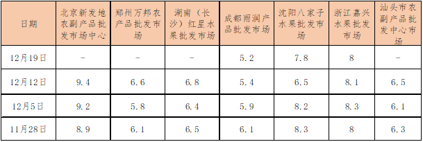 在脐橙产地收购方面,截至12月19日,秭归九月红产地收购均价报5.1元/公斤,环比下跌2.41%,同比上涨0.98%;纽荷尔产地收购均价报4.12元/公斤,环比上涨3.42%,同比上涨23.39%;罗伯逊产地收购均价报2.6元/公斤,环比持平,同比上涨8.33%。
