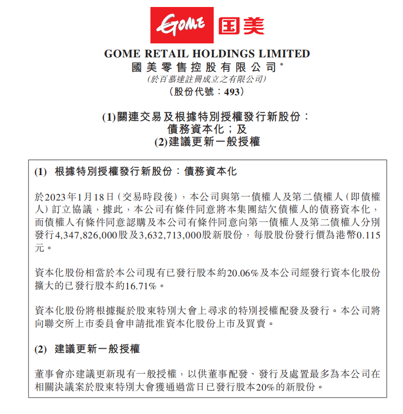 公告显示,国美零售与第一债权人及第二债权人订立协议,公司有条件同意将集团结欠债权人的债务资本化,而债权人有条件同意认购及公司有条件同意向第一债权人及第二债权人分别发行约43.478亿股和36.327亿股新股,每股发行价为0.115港元。