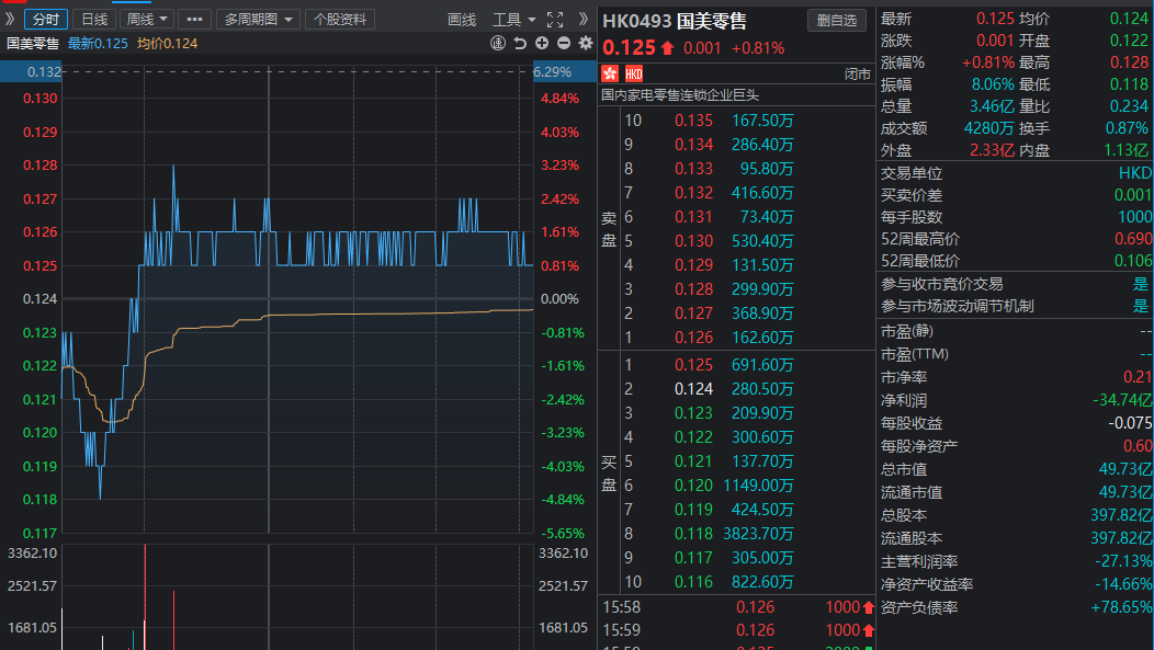 截至1月19日,国美零售盘中涨超3%,截至收盘,报0.125港元/股,成交额达4280万港元。