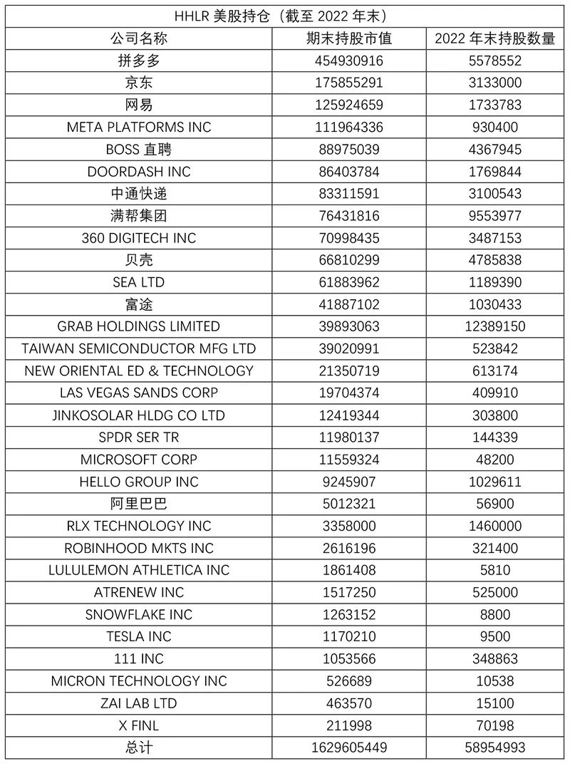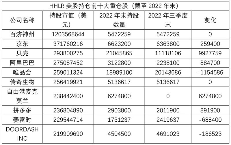 美国证券交易委员会(SEC)网站显示,截至2022年四季度末,HHLR前十大重仓股为:百济神州、京东、贝壳、阿里巴巴、唯品会、传奇生物、自由港麦克莫兰、拼多多、赛富时、DoorDash,其中7只是中概股。