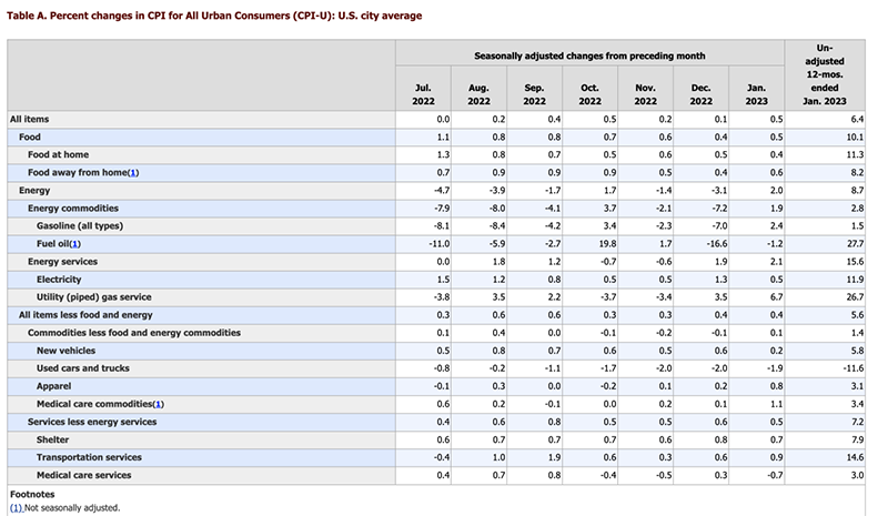 美国劳工统计局的数据显示,美国1月CPI同比上涨6.4%,为连续第7个月放缓,但回落幅度不及预期;1月CPI环比回升至0.5%,未能延续环比下降趋势。剔除波动较大的能源和食品的核心CPI继续回落,1月同比涨幅为5.6%,环比上涨0.4%。