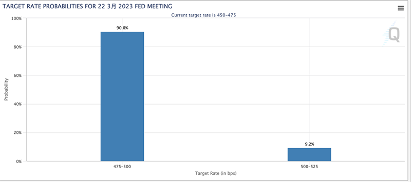 从数据上看,通胀降幅趋于停滞,美联储仍将维持货币紧缩立场。根据CME美联储观察工具,市场认为美联储3月加息25基点基本上是“板上钉钉”。