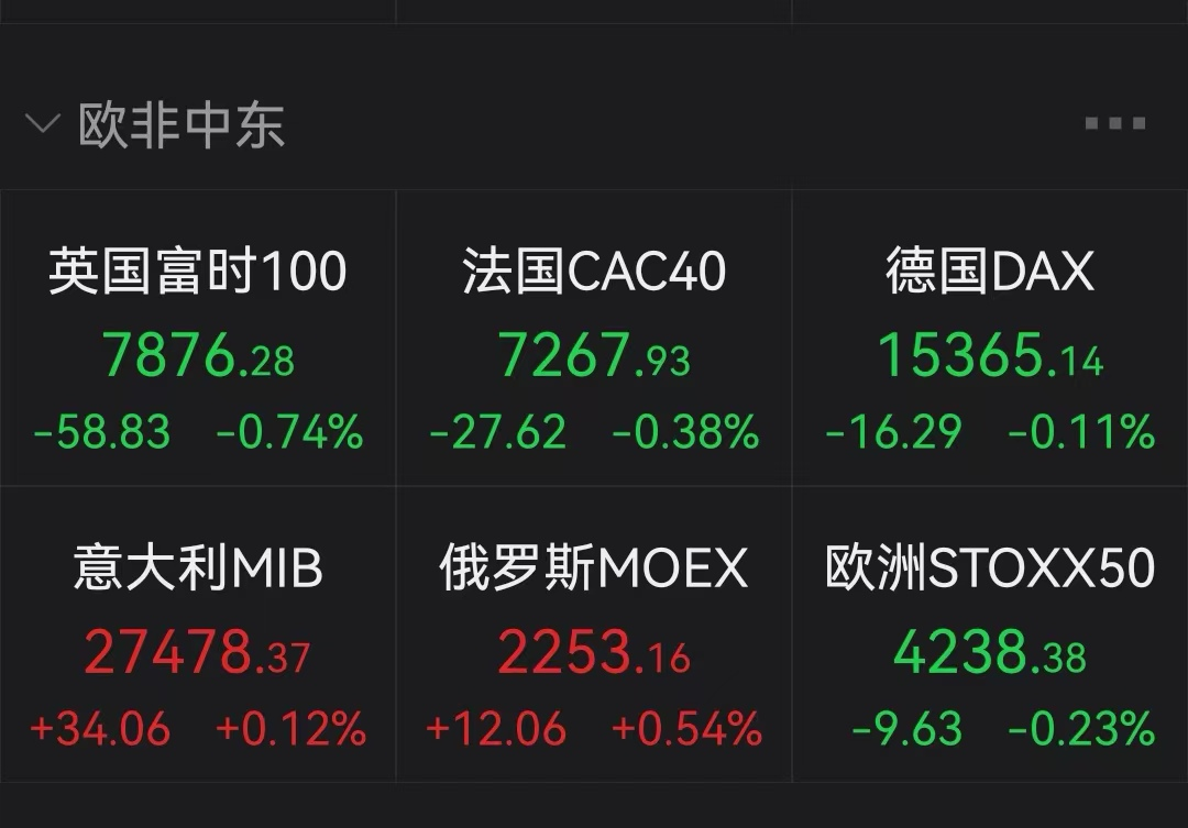 欧股主要指数涨跌不一。截至收盘,德国DAX30指数跌0.11%,英国富时100指数跌0.74%,法国CAC40指数跌0.38%,欧洲斯托克50指数跌0.23%,意大利富时MIB指数涨0.12%。