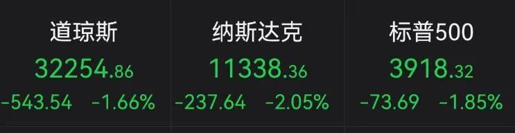 美股三大指数集体收跌,道指跌543.54点,跌幅为1.66%;纳指跌237.64点,跌幅为2.05%;标普500指数跌73.69点,跌幅为1.85%。