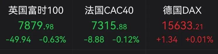欧洲主要股指收盘涨跌不一,德国DAX指数涨0.01%,英国富时100指数跌0.63%,法国CAC40指数跌0.12%。