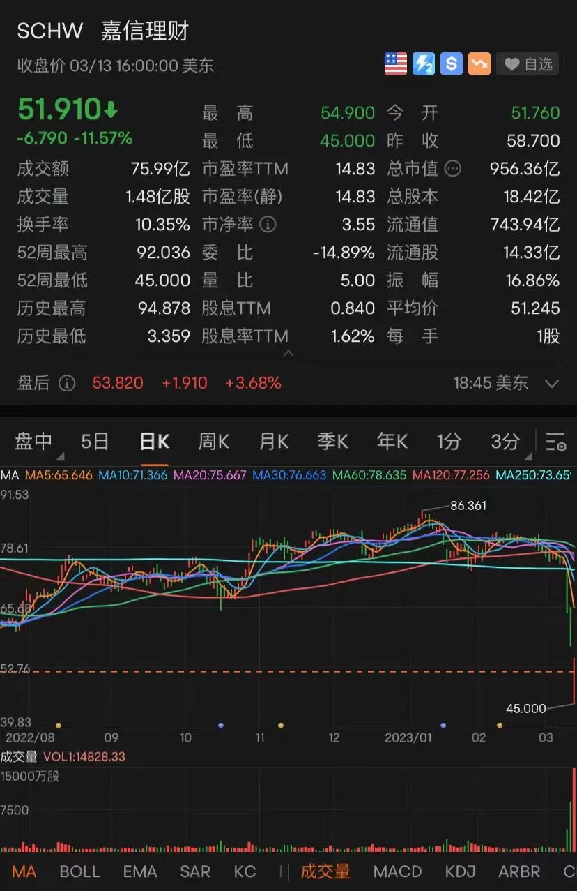 受波及较深的还有资管巨头、资产值为美国第八大银行的嘉信理财。该股盘初最深跌23%,创史上最大单日抛售幅度,收盘跌幅超11%。