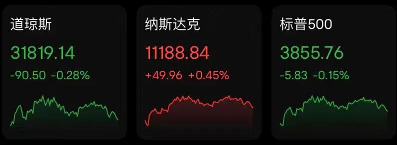 当地时间周一,美股主要指数全天震荡,多空情绪反复博弈。截至收盘,标普500指数收跌5.83点,跌幅0.15%,报3855.76点;道指收跌90.50点,跌幅0.28%,报31819.14点;纳指收涨49.95点,涨幅0.45%,报11188.84点。